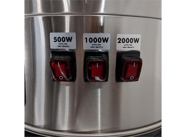 Med tre individuelt styrte varmeelementer, 500W, 1000W og 2000W, har du muligheten til å effektivt holde temperaturen under mesking uten fastbrenning i bunnen. Dette gjør også apparatet svært fleksibelt dersom du ikke har tilgang til 16A kurs. Har du kun 10A tilgjengelig benytter du max 2000W ved oppvarming. (2500W kan for noen fungere på 10A, avhengig av lokal spenning og type sikring).