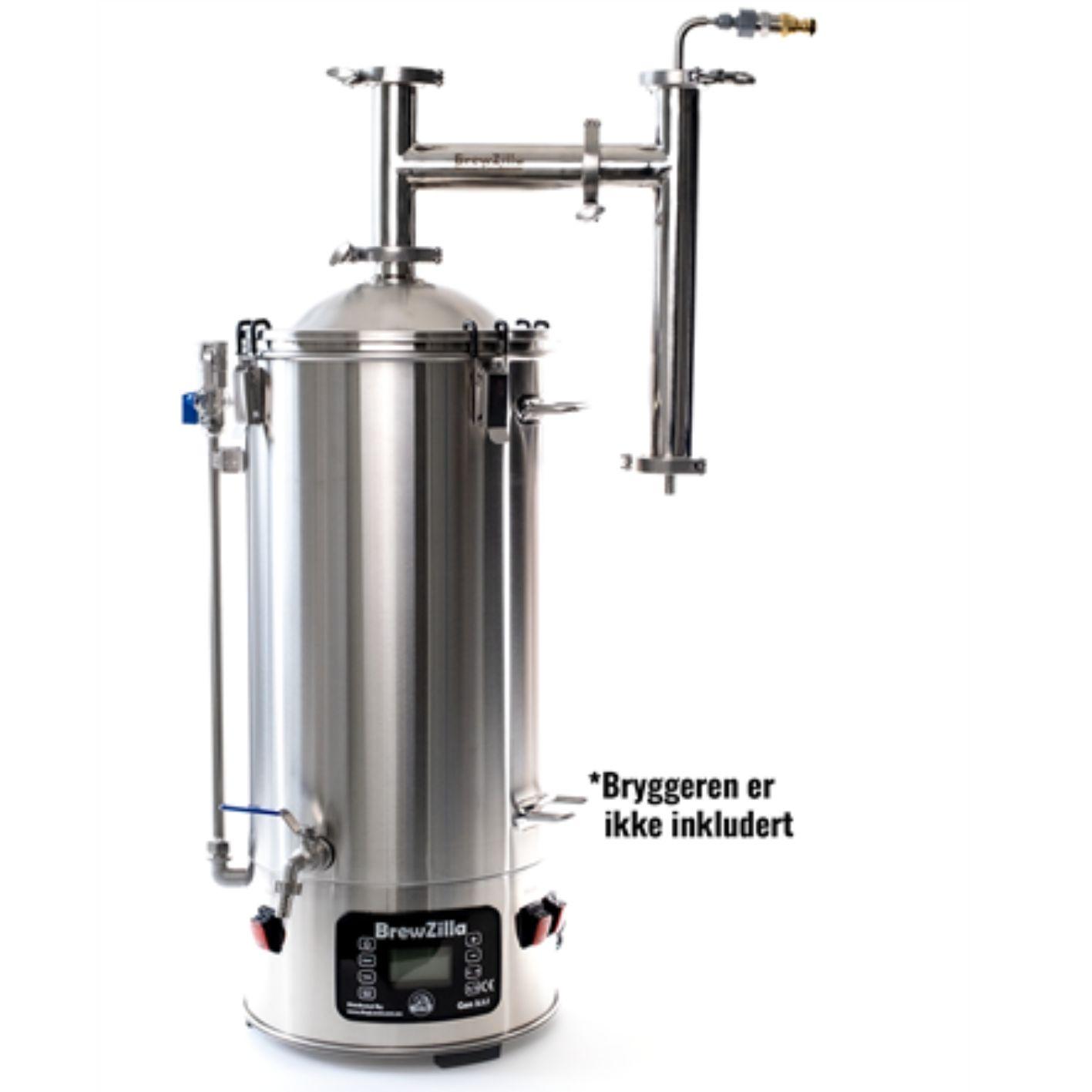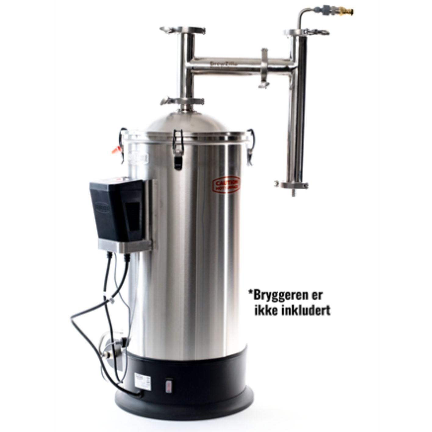 Kondensatoren fungerer ved at kaldt vann tilføres, og gjennom en innebygd dyse kjøler dampen ned slik at den renner ut i vannform. Vannet føres ut i bunnen via en slange (Vi anbefaler 1/2″ silikonslange, denne er ikke inkludert i settet), og ned i et sluk, eller egnet beholder.