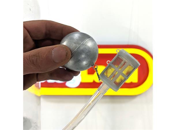 Praktisk filter som kan monteres på enden av slangen ved bruk av flyteball til servering og overføring.