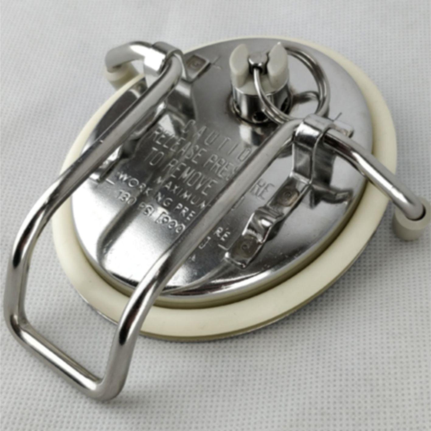 Laget av rustfritt stål. Kommer levert med O-ring og overtrykksventil. På insiden har lokket et krok som kan benyttes til f.eks tørrhumling. (se bilde)