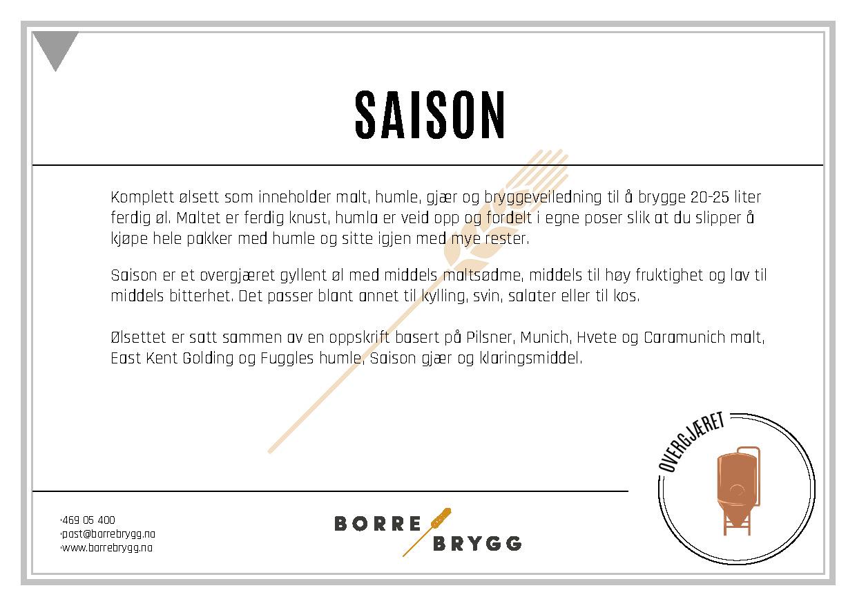 En typisk Saison med god utgjæring, karakter av brød og svak karamell. Gjæren gir krydder frukt og peppertoner. Dette gjør saison kategorien både lett og kompleks på en gang.