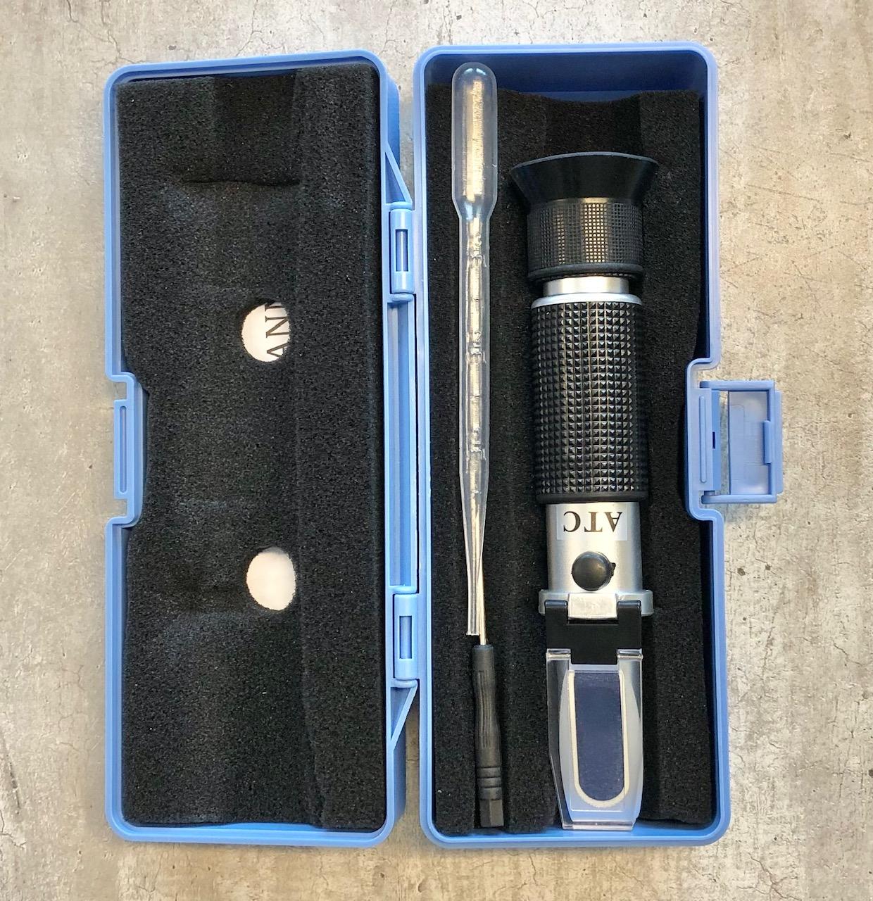 Refraktometeret er et kjekt hjelpemiddel for bryggere. Denne modellen leser både Standard Gravity of Sugar in Water og Standard Gravity for Wort, og selvfølgelig Brix.
